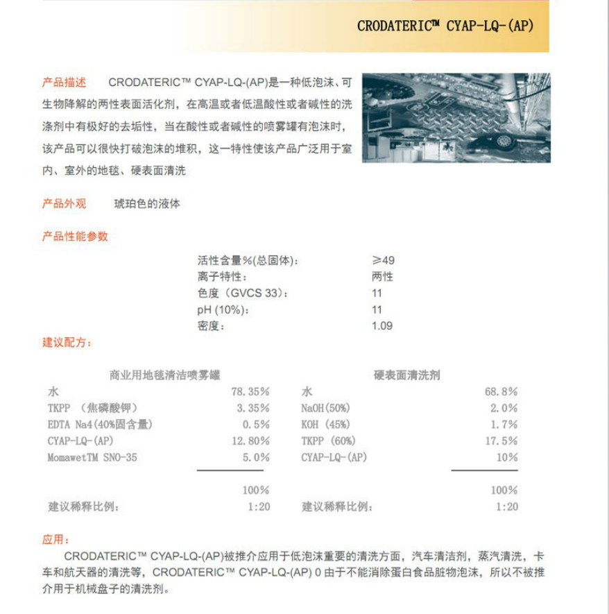 Crodateric CYAP is an amphoteric surfactant that can offer hydrotroping and detergency and is particularly effective in extreme pH formulations. Due to this stability in harsh environments, it is regularly used in heavy duty industrial cleaners.
